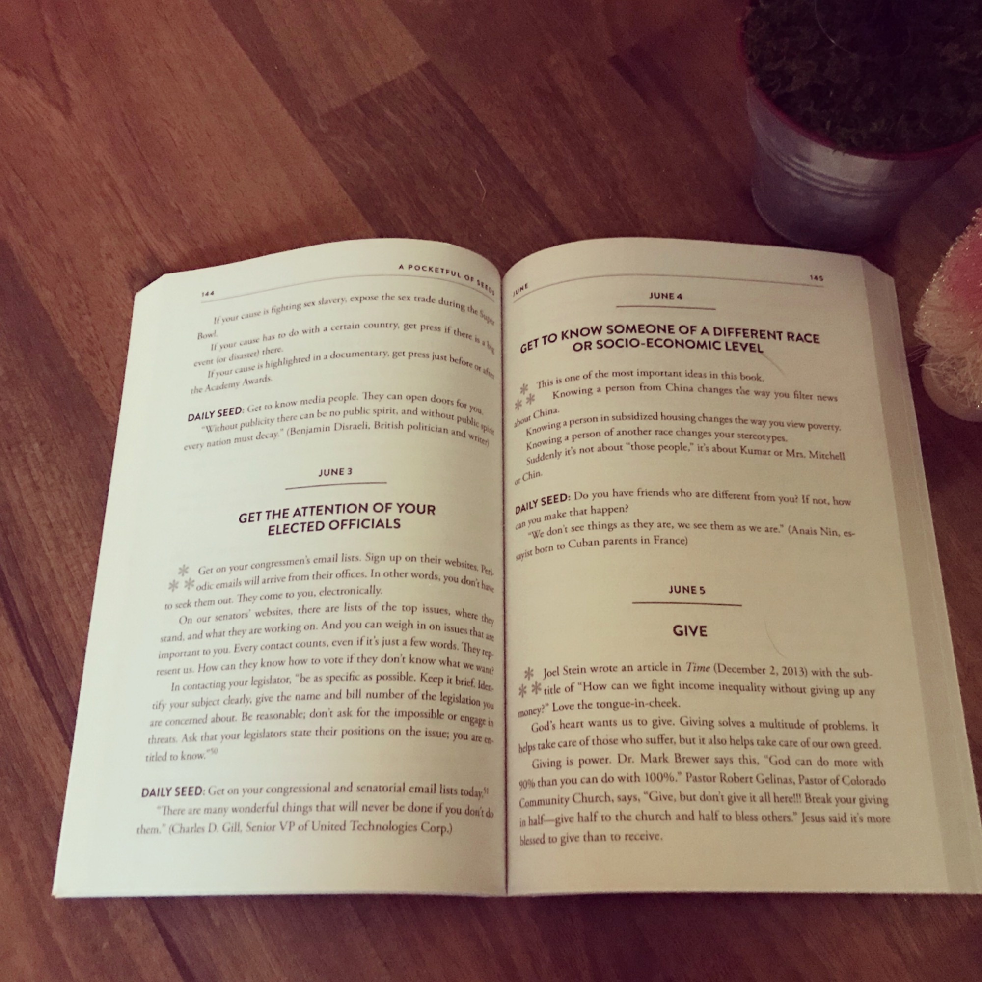 The book is laid about beautifully and each day has an easy-to-read piece that inspires you to help others and do some good. I found the words uplifting and felt spurred by each challenge, determined to activate each of them. The author shares that we can put into action generosity, kindness, hope, and love. It all starts small. It starts simple. And it starts with us. She firmly believes that our actions will create a domino effect, spreading these seeds from one person to the next.