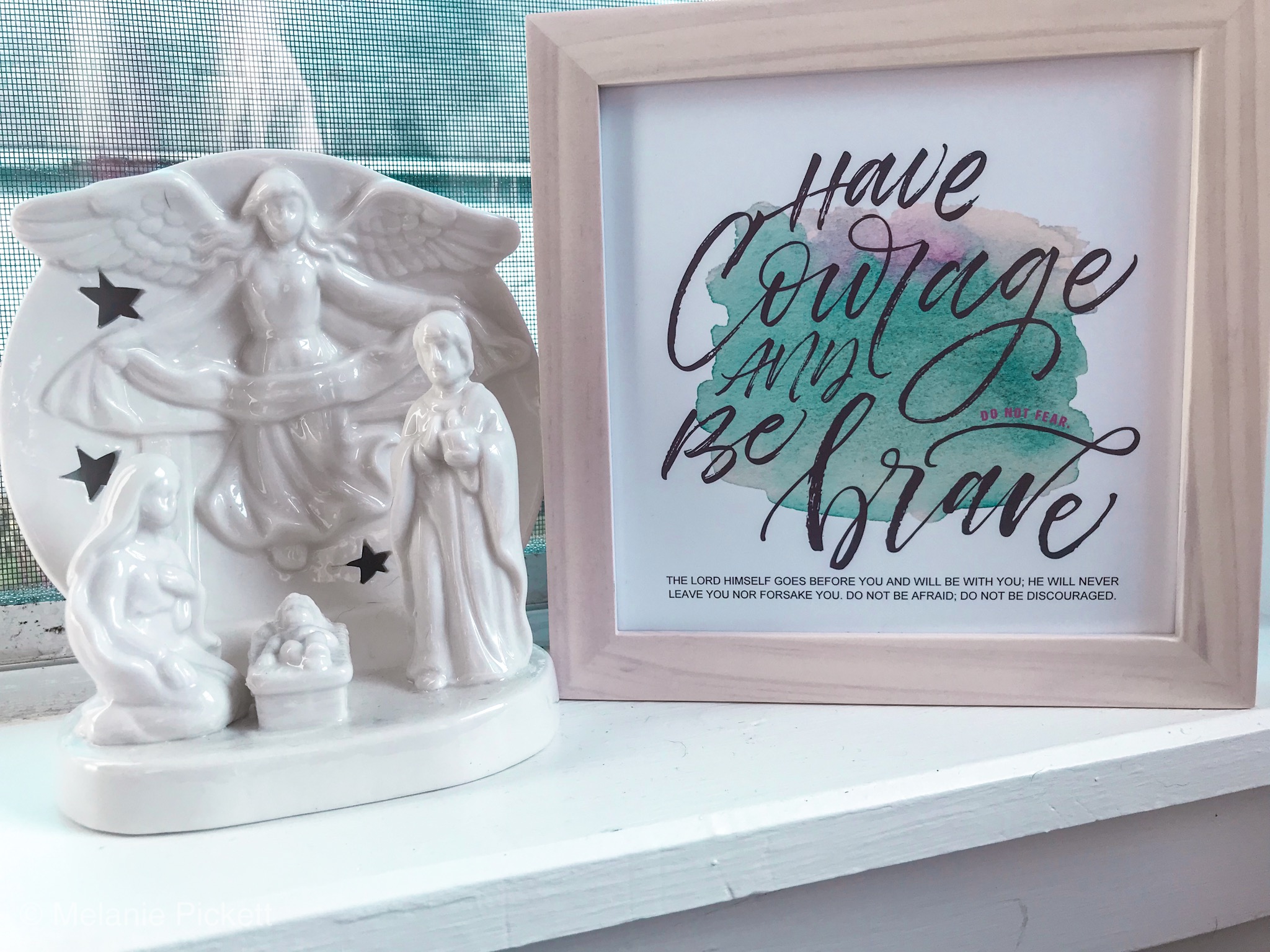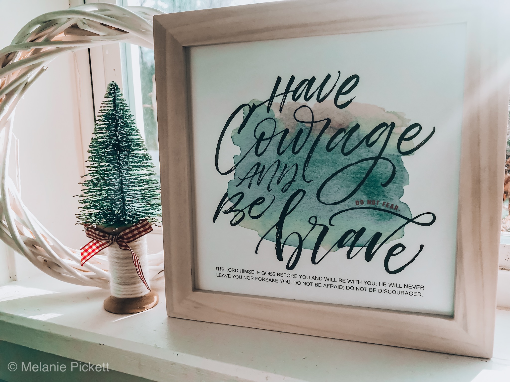 Here’s the one I ultimately chose, “Have Courage Verse”. I added Deuteronomy 31:8 at the bottom of the print. It’s beautiful and I’m so pleased with it. It would serve as a lovely gift, but I like it so much that it will be added to our family gallery wall. It’s a very meaningful piece. The frame is completely sturdy and the print is even more beautiful and colorfully vibrant than the photos here.