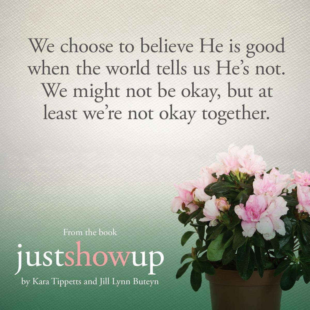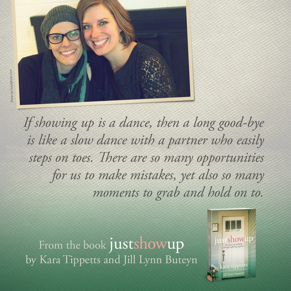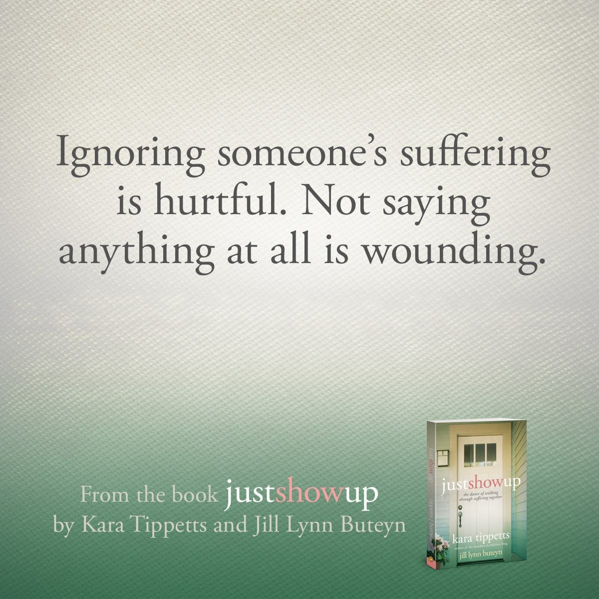 The book I’m sharing with you is “Just Show Up: the dance of walking through suffering together” by Kara Tippetts and Jill Lynn Buteyn.