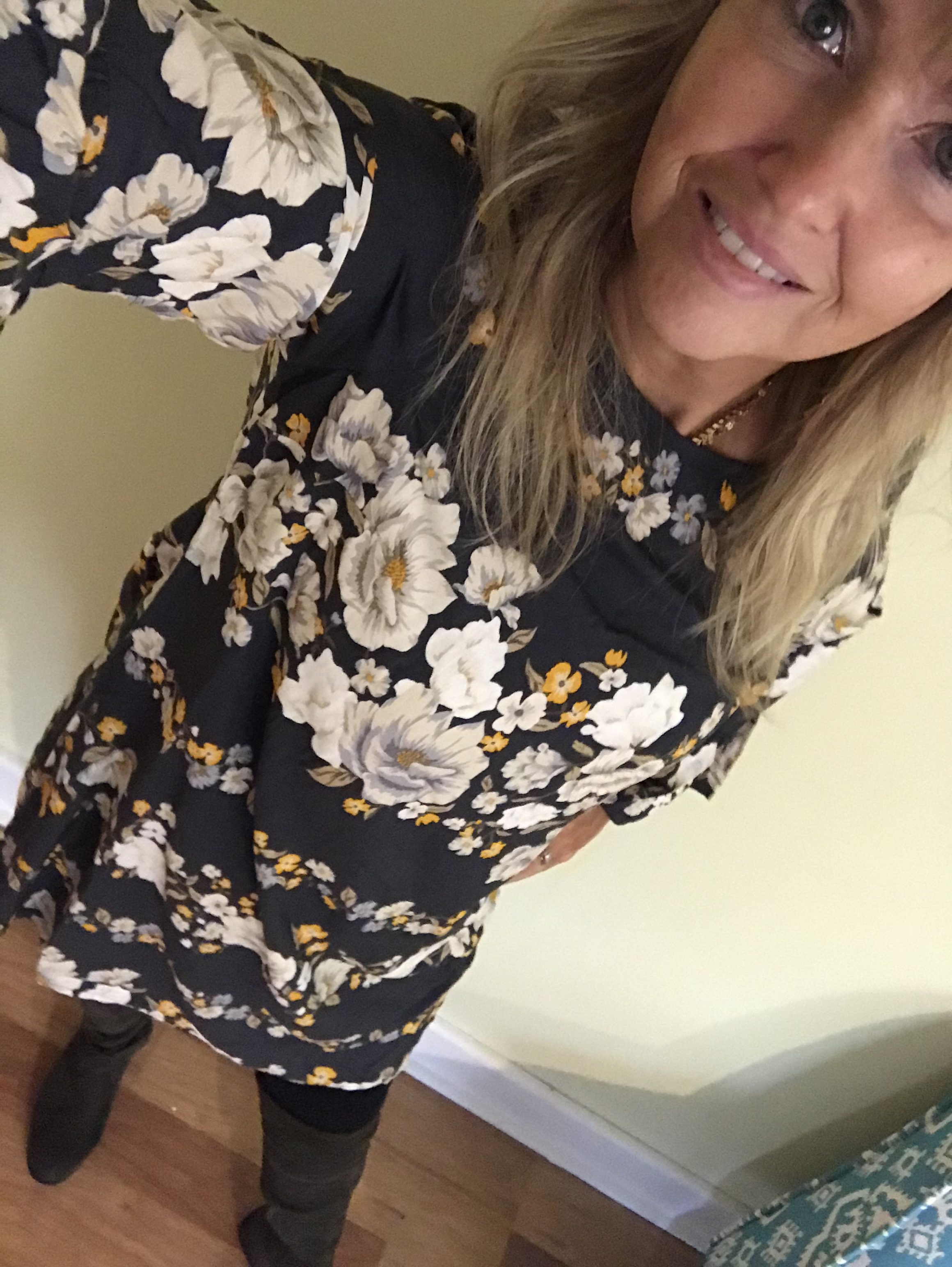 Sunday was more relaxed. We went to church and afterwards, took lunch to my mother-in-law’s house and visited for a few hours before returning home to, as my kids would say, “just chill.” But I did wear this cute Old Navy dress that I scored for $12 on sale. There are four patterns and they’re all so cute for winter with boots or even spring or summer. They’re very lightweight.